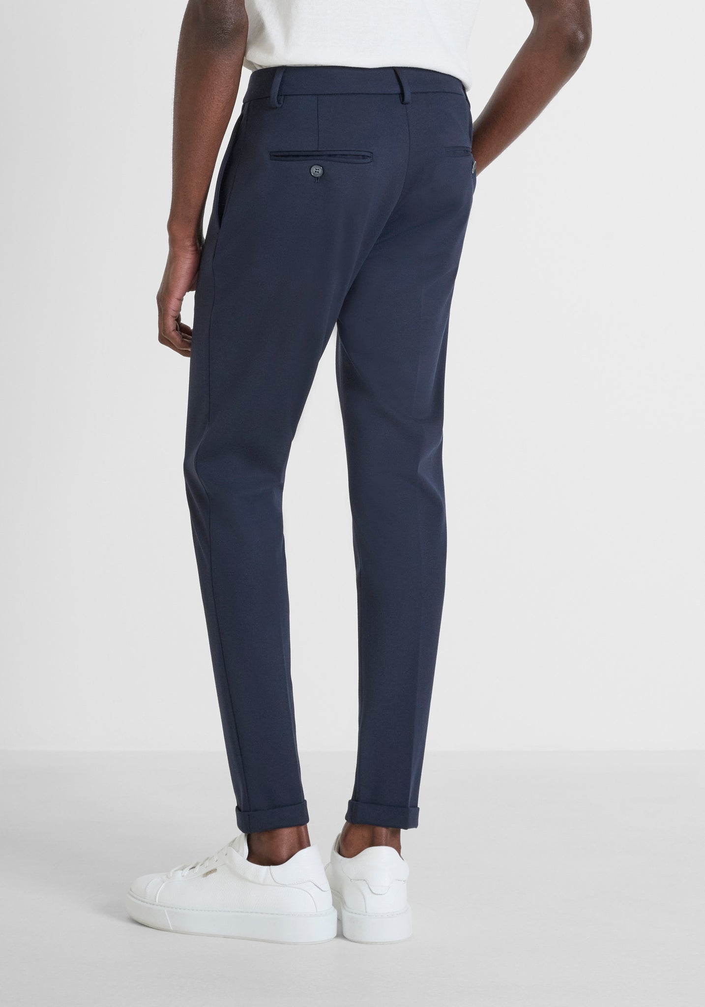 Estos pantalones de Antony Morato están confeccionados con un tejido de mezcla de viscosa elástica. El ajuste superceñido es ideal para quienes desean resaltar la figura. Con un cierre clásico de cremallera oculta y botón, cuentan con dos bolsillos de tipo americano y dos bolsillos ribeteados con botón en la parte posterior. Los dobladillos de los tobillos completan la prenda.